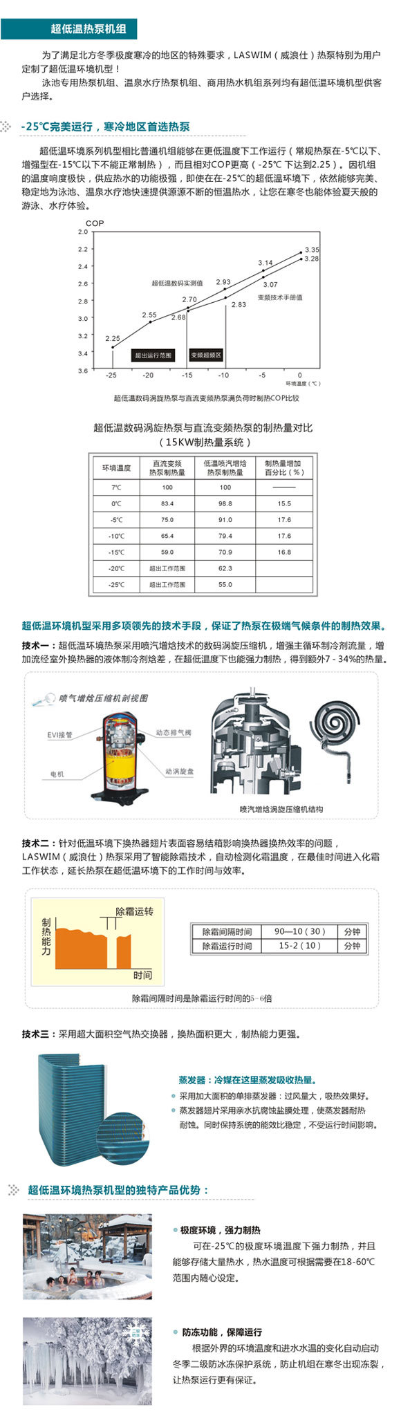 To meet the special needs of extremely cold regions in northern China during winter, LASWIM (Weilangs) heat pumps are specially customized for users with ultra-low temperature models! Swimming pool dedicated heat pump units, hot spring spa heat pump units, and commercial hot water units are all available in ultra-low temperature models for customers to choose from.